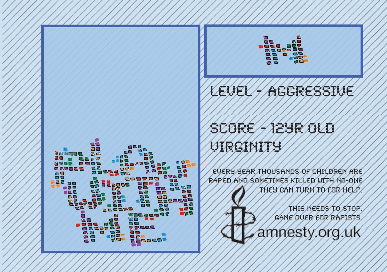 Uni project: using hand-drawn typography for the main concept, put together a poster for a cause Amnesty support. I chose child rape, as this issue dealt with children I felt it needed to be almost childish to get a stronger message across. Eventually I decided to use the words ‘play with me’ in a tetris format (the words being formed by tetris blocks) as it has a double meaning and fitted in well with ‘game over for rapists’.
